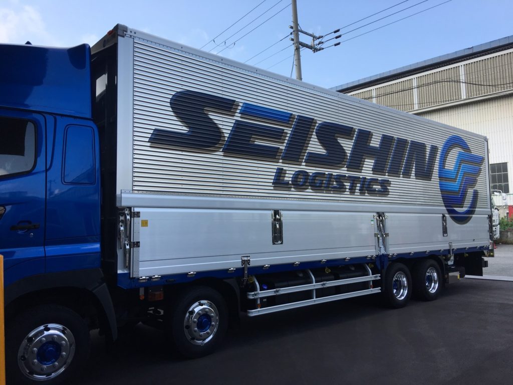 今週2台目の施工です! 盛進通商株式会社様の大型4軸低床の新車のペイントを承りました。 デザインも何度も打ち合わせさせていただき、ロゴマークがあおり部分にかかるように配置して、とてもカッコよく出来上がりました! 来週2台目のご入庫の予定も頂き、どんどんカッコいいトラックが増えていきますね!
